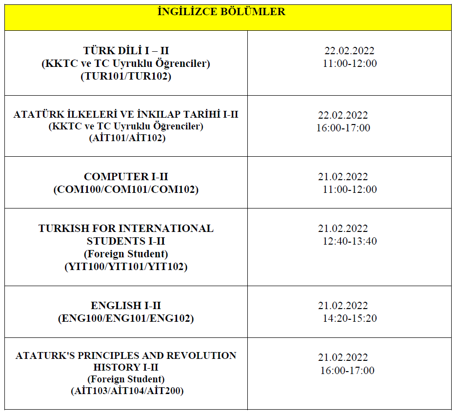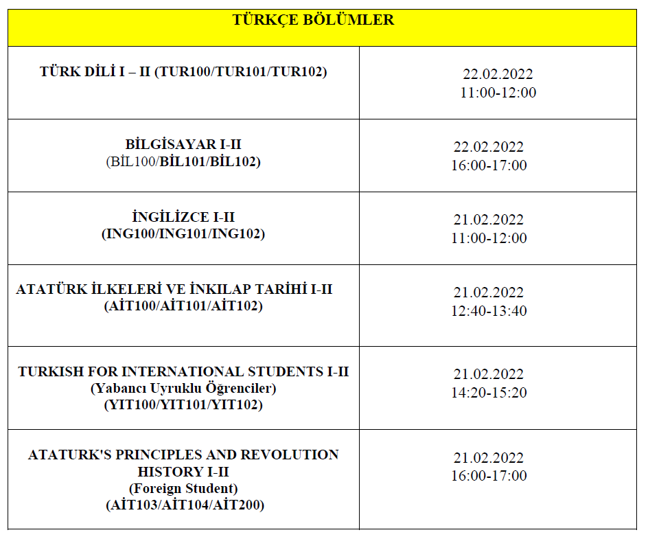 Üniversitemizde Türkçe ve İngilizce dilinde eğitim yapan bölümlere sunulmakta olan ortak dersler için sadece bölüme yeni kayıt yaptırmış (ilk defa) öğrenciler için 21.02.2022 ve 22.02.2022 tarihinde muafiyet sınavı yapılacaktır. Alınabilecek muafiyet sınavlarının bölüm ve uyruklara göre dağılımı aşağıdaki gibidir: